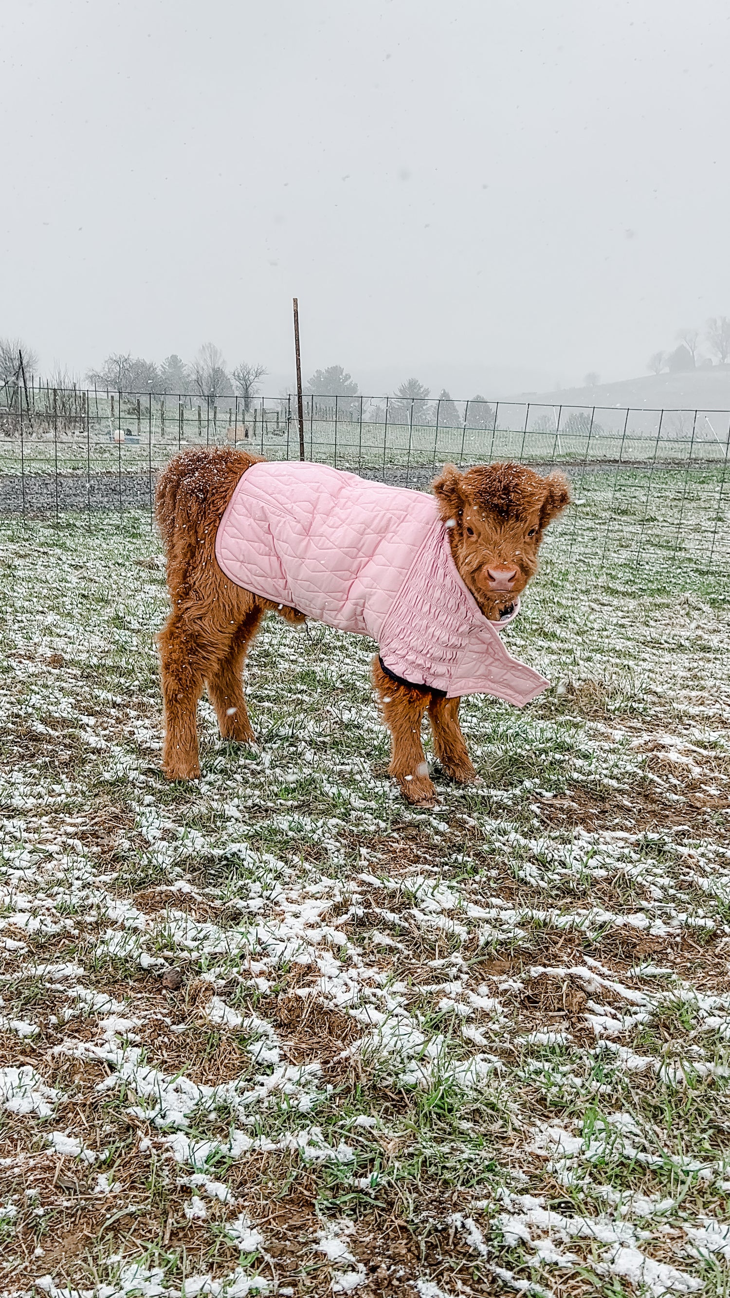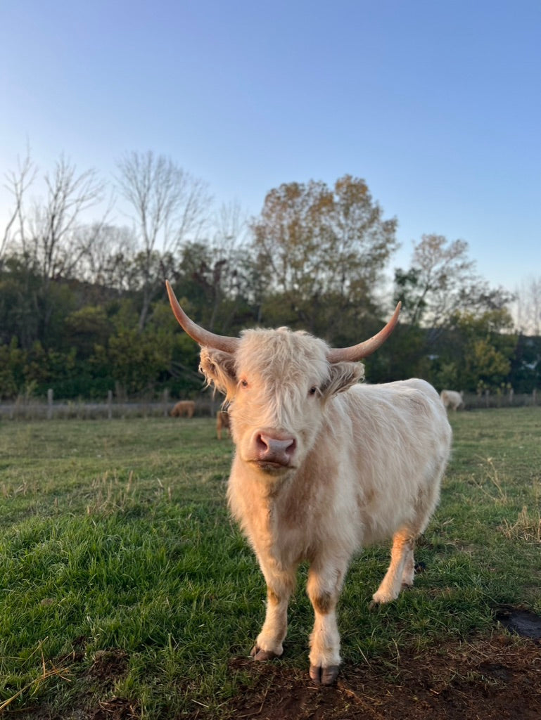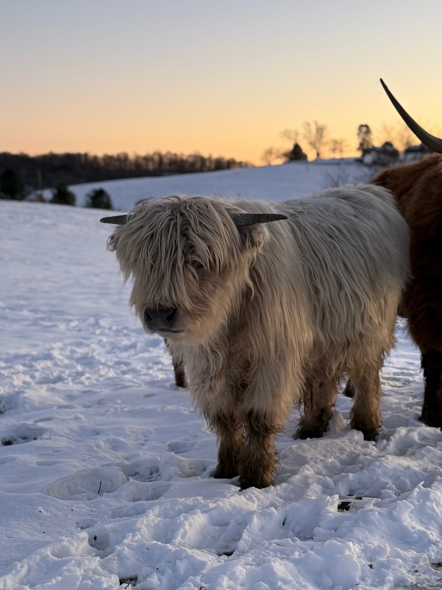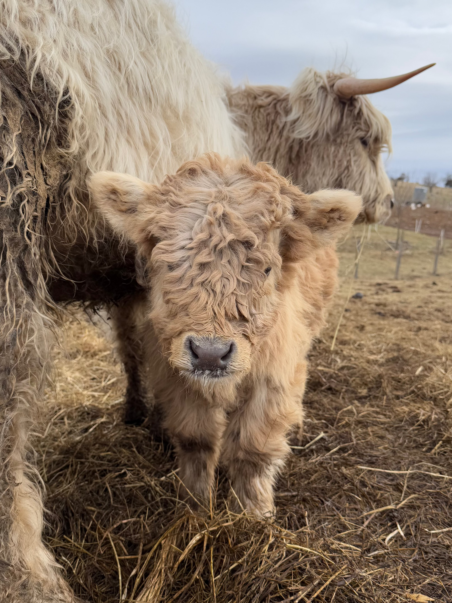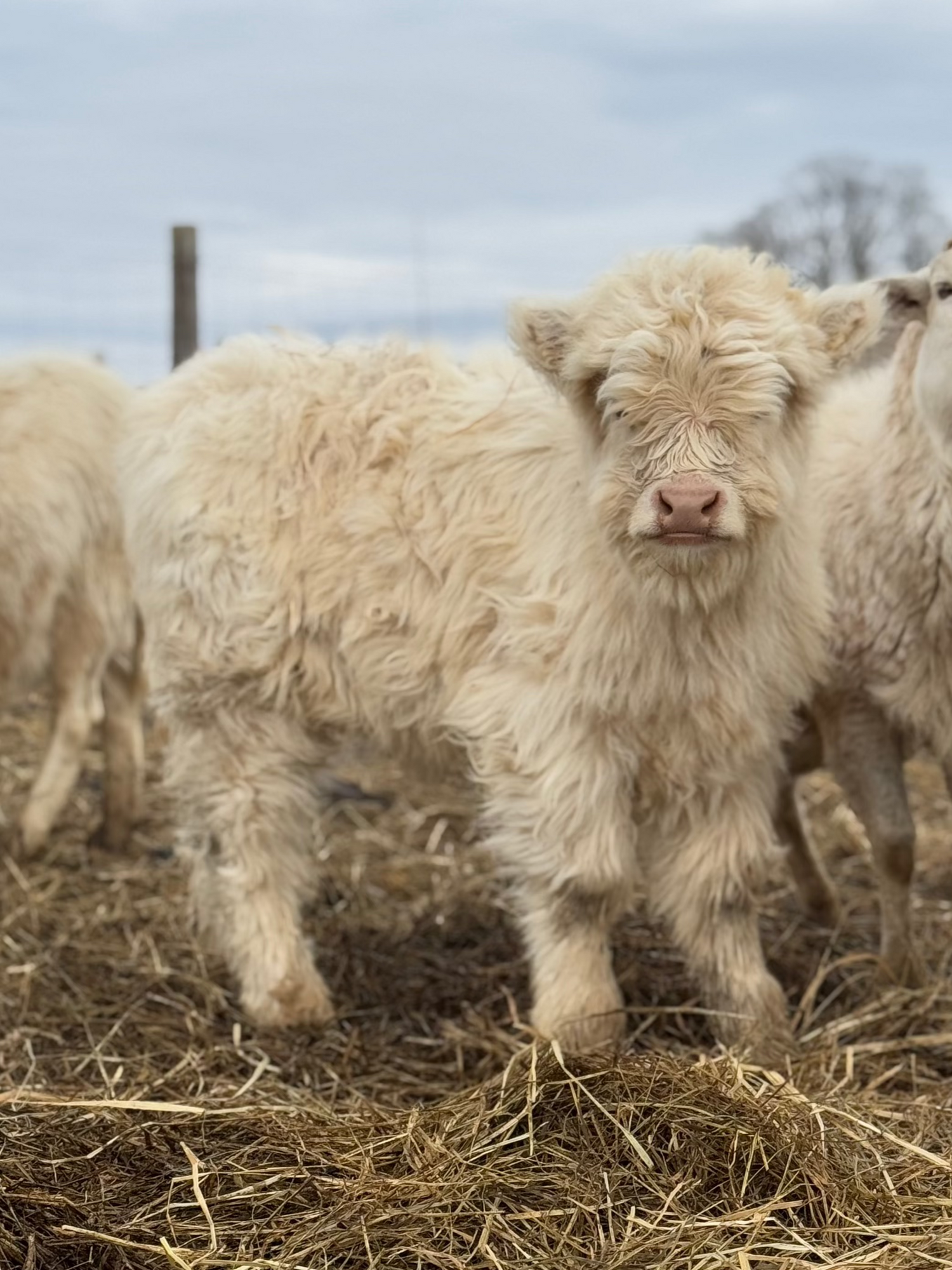 Juniper is our yellow heifer calf out of Virginia. She is super hairy and fluffy! Full of sweetness like her mom and adores her best friend, Poppy. She is currently living with Poppy until she is old enough to breed. We are hoping to have a calf from her in 2026.